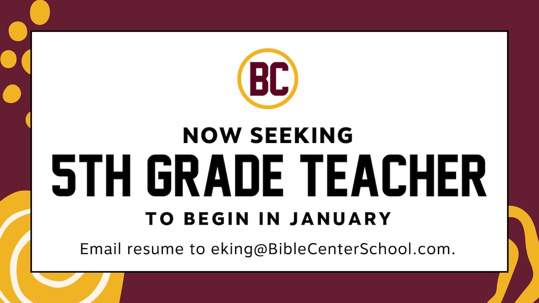 Bible Center School is looking for a passionate, Christ-centered educator to join our team! We are currently seeking a 5th Grade teacher to begin in January. Come be a part of shaping the next generation! Email Assistant Principal, Emily King to inquire.